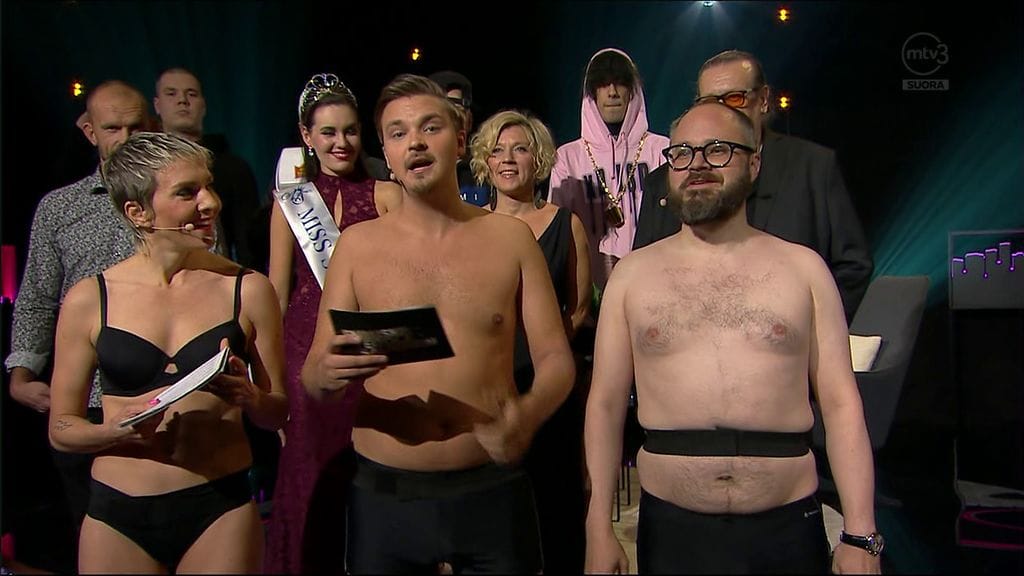 Tuomas Enbuske, Maria Veitola ja Roope Salminen aloittivat illan EVS-ohjelman pelkissä alusasuissaan.