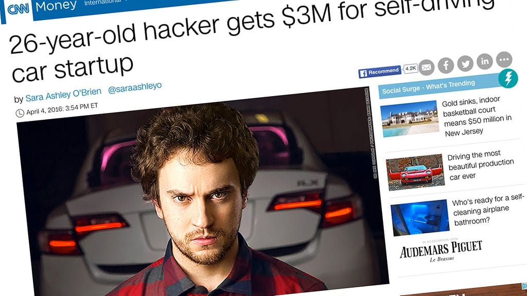 Yhdysvaltalaisen George Hotzin, 26, startup-yritys Comma.ai sai vastikään 3,1 miljoonan dollarin rahoituksen sijoitusyhtiö Andreessen Horowitzilta. Hotzin yrityksessä työskentelee neljä henkilöä ja heidän käsissään on ohjelmisto, joka muuttaa tavallisenkin auton vähintään puoliautomaattiseksi.