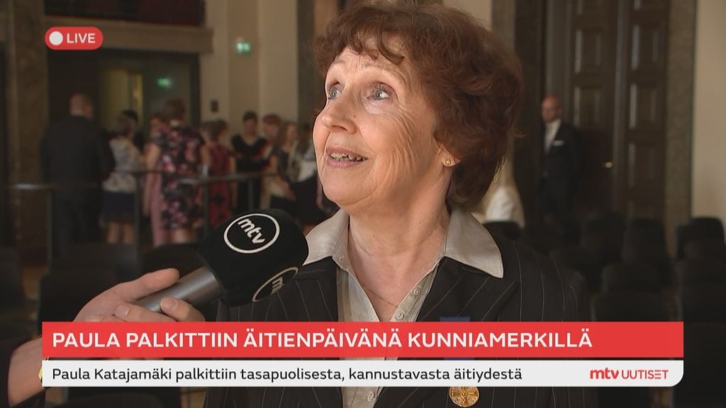 70-vuotias Paula Katajamäki on yksi niistä 35 äidistä, jotka palkittiin tänään Helsingin Valkoisessa Salissa Suomen Valkoisen Ruusun ritarikunnan ensimmäisen luokan mitalilla.