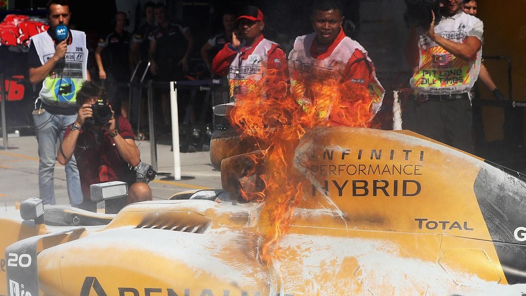 Malesiassa nähtiin perjantaina nykyformuloilla harvinainen tilanne, kun Kevin Magnussenin Renault-auto puski väkeviä liekkejä moottorin päältä.