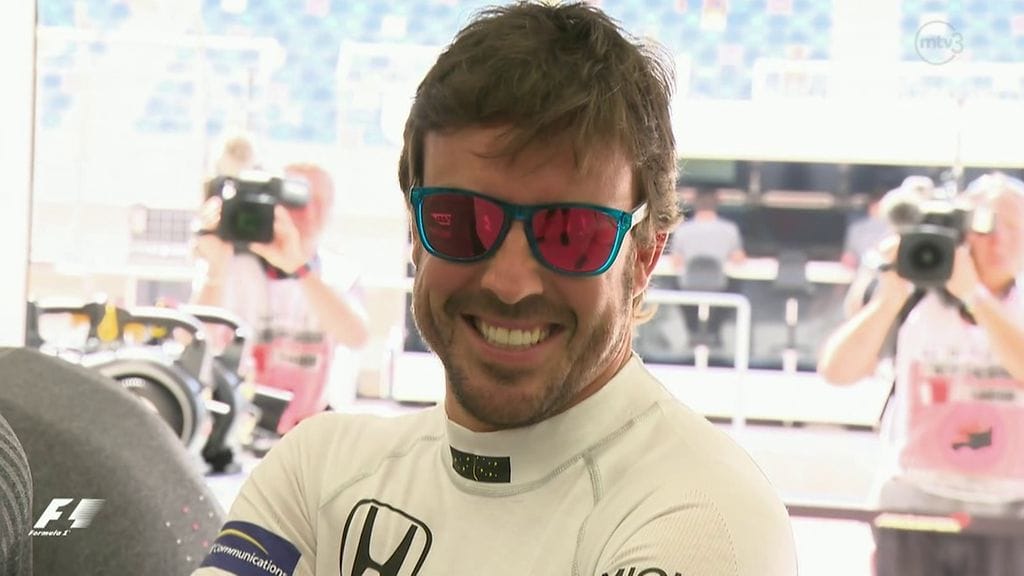 McLarenin tähtikuski Fernando Alonso oli tavallista iloisemmalla päällä Bahrainin GP:n varikkoalueella.