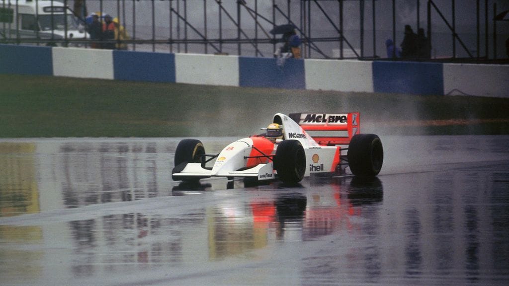 Vuoden 1993 Euroopan GP ajettiin sateisissa olosuhteissa, ja McLarenin Ayrton Senna tykitti ylivoimaiseen voittoon. Brasilialaislegenda nousi avauskierroksella viidenneltä sijalta kärkeen – ja millä tavalla.