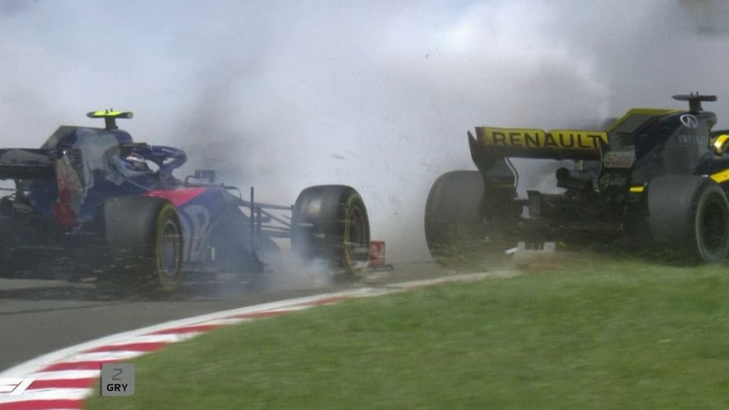 Haasin renkaista nousi ilmaan paksu savupilvi eivätkä takaa tulleet voineet reagoida ajoissa vaaratilanteeseen. Renault'n Nico Hülkenberg ehti väistää Grosjeania, mutta Toro Rosson Pierre Gasly ajoi suoraan päin maanmiestään.