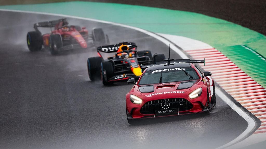 Taustalla on tilanne, jossa Ferrarin Carlos Sainz ajautui päin reunavalleja. Sainzin Ferrari jäi radanvarteen niin, että paikalle tuotiin hinaustraktori.