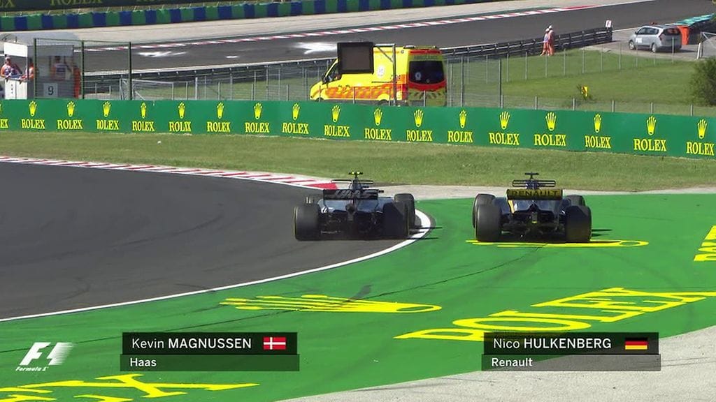 Kaksikko taisteli 11. sijasta kisan loppupuolella. Hülkenberg yritti ohitusta Magnussenista ulkokautta, mutta Haas-kuski sulki oven, minkä seurauksena saksalainen ajautui nurmikolle.