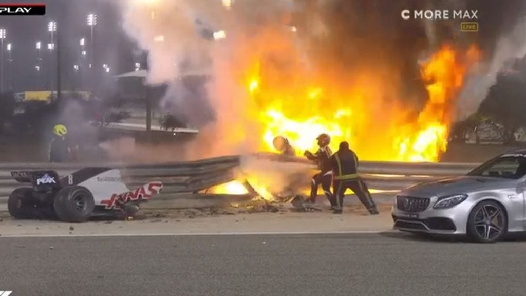 Grosjeanin auto räjähti liekkeihin, kun ranskalaiskuljettaja syöksyi lähtökahinassa jyrkässä kulmassa päin teräskaidetta. Kuski kuitenkin pääsi autosta ulos ripeästi ja sai vain lieviä palovammoja käsiinsä ja nilkkoihinsa.