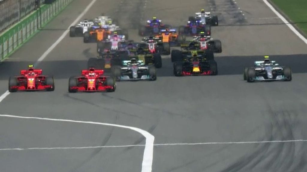Kakkosruudusta lähtenyt Räikkönen joutui lähtösuoran likaiselle reunapuolelle, kun Vettel suuntasi reittinsä hänen laidalleen.