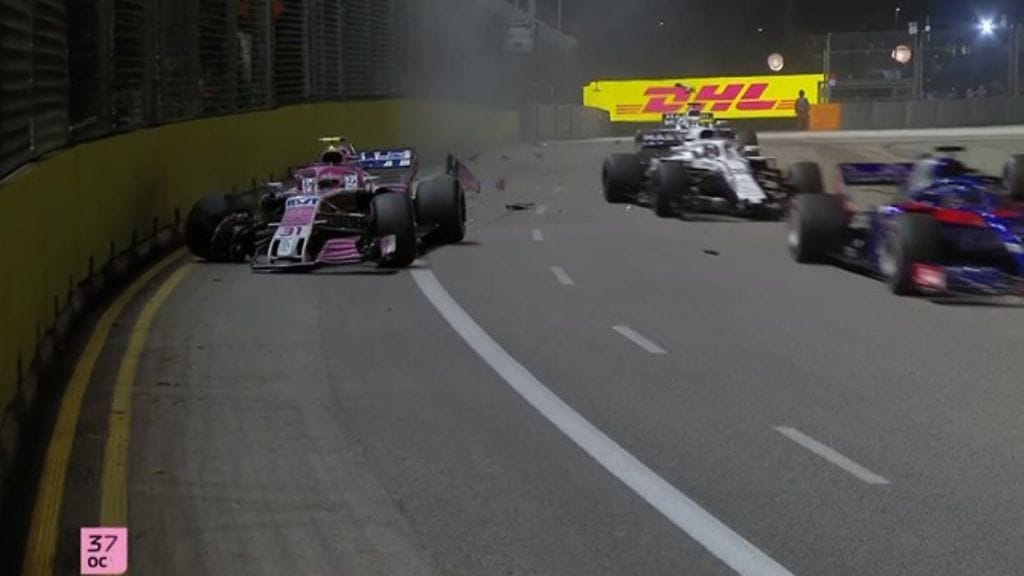 Force Indian kuljettajien välinen taistelu sai ruman käänteen Singaporen F1-kisan startissa, kun ohitusta yrittänyt Esteban Ocon sinkosi seinään tallikaverinsa Sergio Perezin renkaasta.