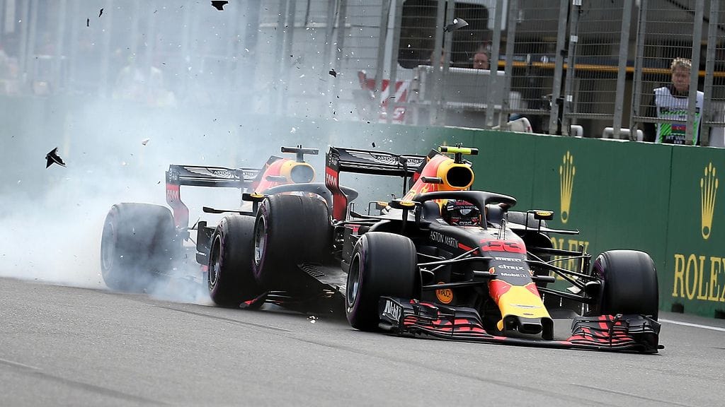 Red Bullit olivat 12 kierrosta ennen maalia sijoilla neljä ja viisi, kun heidän keskinäinen taistelunsa johti peräänajoon Ricciardon hiillostettua Verstappenia Bakun katuradalla. Vikaa oli kummassakin kuskissa. Verstappen teki siirtymäliikkeitä edellä, kun taas Ricciardo myöhästyi omassa jarrutuksessaan. Kaksikolla oli lupa taistella keskenään, kunhan eivät osu toisiinsa.