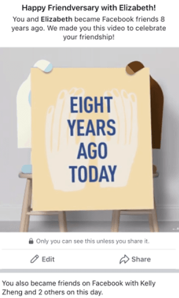 Omalta välilehdeltään löytyvä muisto-osio muistuttaa käyttäjäänsä esimerkiksi kyseisenä päivänmääränä historian saatossa tapahtuneista asioista, kuten yhteisistä julkaisuista tai uusista kaverilistalle lisätyistä ystävistä. Osion sisältö on usein sellaista, mikä on jo aiemmin nähty, mutta se sisältää myös uusia julkaisuja ainakin sellaisille käyttäjille, jotka käyttävät palvelua harvemmin.