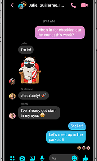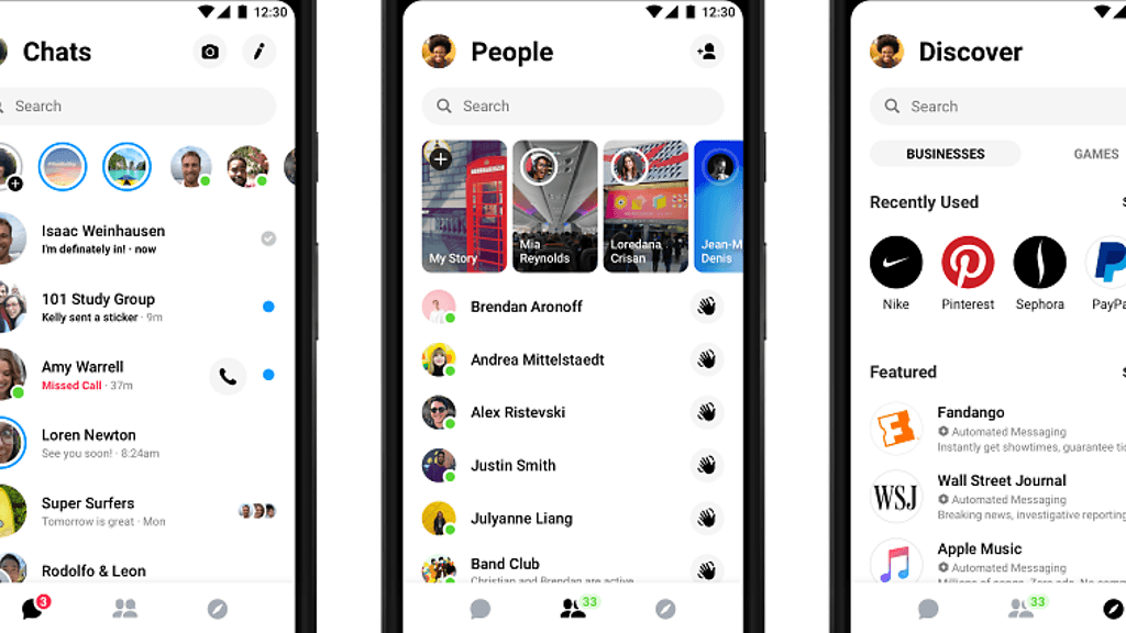 Vastedes välilehtiä on Messengerissä ainoastaan kolme entisen yhdeksän sijaan. Keskustelut-välilehti sisältää sekä yksityis- että ryhmärupattelut, Ihmiset-osio kaikki Messengeriin liitetyt kontaktit ja Tutki-välilehti puolestaan esimerkiksi peliosion, uutissyötteen ja mahdollisuuden lähettää viestejä yrityksille tai kommunikoida vaikkapa verkkokauppojen kanssa.