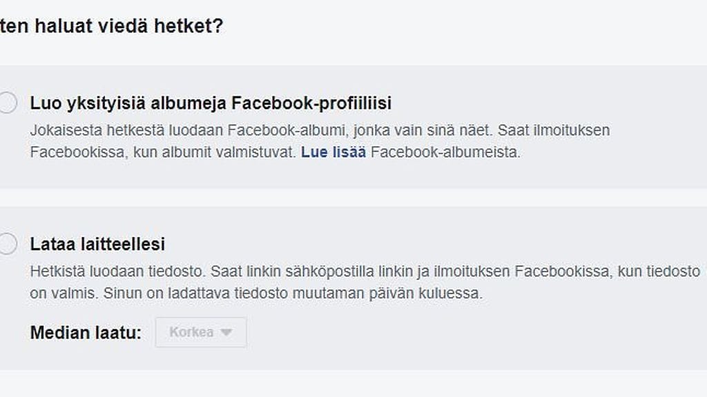 Kuvat voi taltioida Facebookin verkkosivujen kautta tai suoraan sovelluksesta.