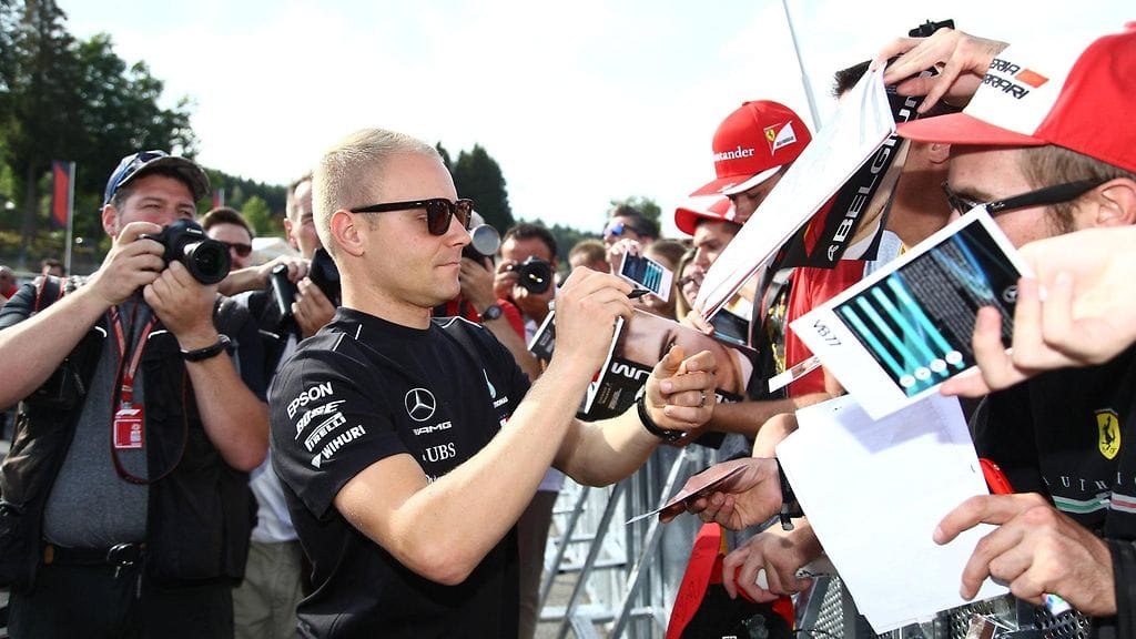 Belgian Grand Prix on kerännyt paikalle suomalaisfaneja ja Suomen liput liehuivat, kun kaksikko jakoi nimikirjoituksia. Bottas pääsi myös kirjaamaan nimikirjaimensa yhteen siniristilippuun.