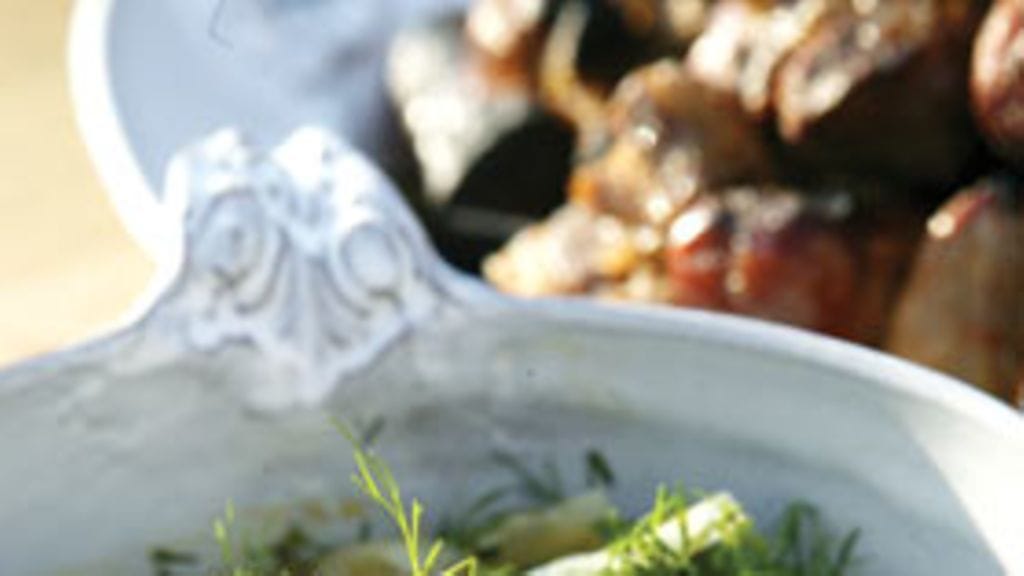 Vinegretin valmistus: Kun fenkoli on pehmeää, poista pannun kansi ja mausta suolalla ja pippurilla. Sekoita joukkoon öljy, tilli ja sitruunamehu. Tarjoa sitruuna- ja appelsiinimarinoidun porsaan kanssa.