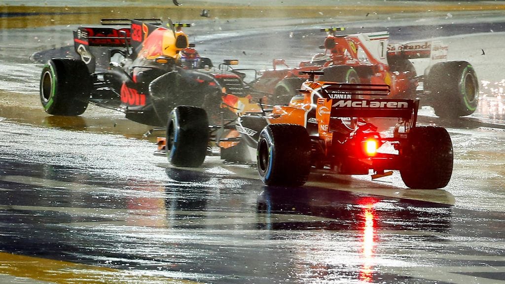 Alonso sai Singaporessa toissa viikolla loistavan lähdön kahdeksannesta ruudusta, ja espanjalainen oli ajamassa ulos avausmutkasta kolmannella sijalla. Tuloksena oli kuitenkin keskeytys, kun Ferrarin Kimi Räikkösen auto osui Alonson menopeliin avausmutkassa. Räikkönen, Sebastian Vettel ja Max Verstappen olivat törmänneet toisiinsa hetkeä aiemmin, eikä suomalaiskuski voinut estää osumaa Alonsoon.