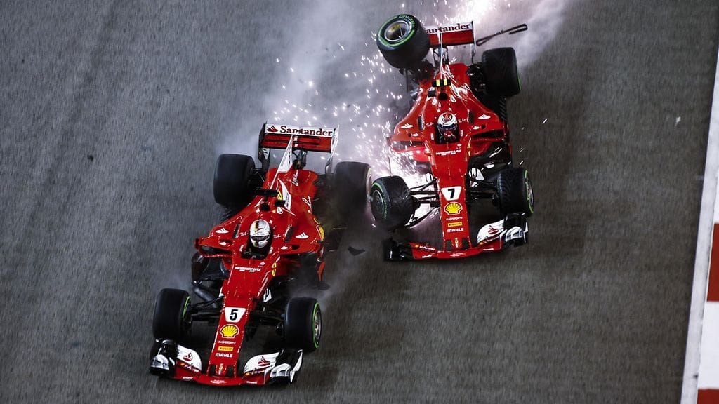 Vettel, Räikkönen ja Red Bull -kuski Max Vertappen kolaroivat keskenään heti kisan alussa (video yllä). Räikkösen auto kolahti voimalla Vettelin menopelin kylkeen, ja saksalaisen Ferrarin sivuponttoni ja jäähdytin kokivat kovia.
