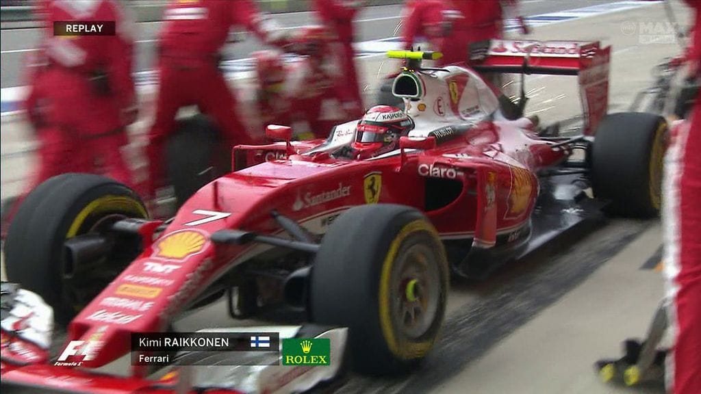 Räikkönen oli kisassa neljäntenä, kun viimeinen kolmesta varikkostopista meni pahasti pieleen. Ferrarin mekaanikoilla jäi oikea takapyörä kiinnittämättä, kun suomalaiselle näytettiin jo vihreää valoa. Räikkönen huomasi irtonaisen pyörän nopeasti ja pakitti takaisin varikkosuoralle.