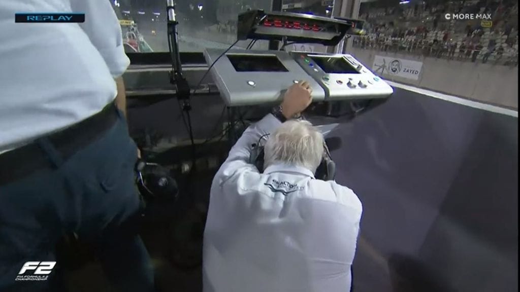 Kolari tapahtui aivan kisan lähettäjän, Kansainvälisen autoliiton FIA:n kilpailujohtajan Charlie Whitingin kopin edessä. Uusintakuvissa näkyy, kuinka Whiting maastoutuu rysäyksen hetkellä salamannopeasti lähetyskoppinsa lattialle.