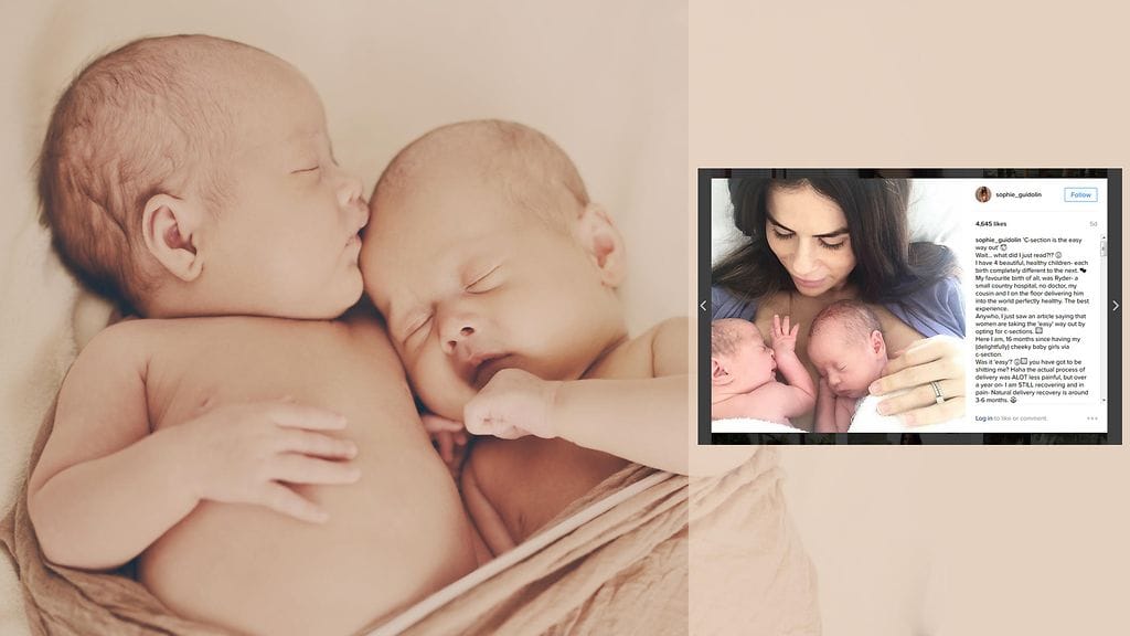 Kaksostytöt synnyttänyt 27-vuotias fitness-harrastaja Sophie Guidolin sai lapsensa keisarileikkauksella. Hän äimistyi luettuaan artikkelin, jonka mukaan leikkaus on "helppo tapa" synnyttää, kertoo kidspot.com.au.