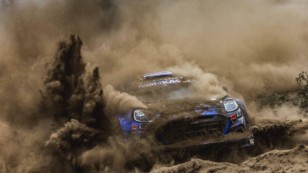 Kreikkalainen bisnesmies Jourdan Serderidis ajaa Ford M-Sportin autolla Kenian rallissa. Lauantain ensimmäisellä erikoiskokeella hän oli suurissa vaikeuksissa.