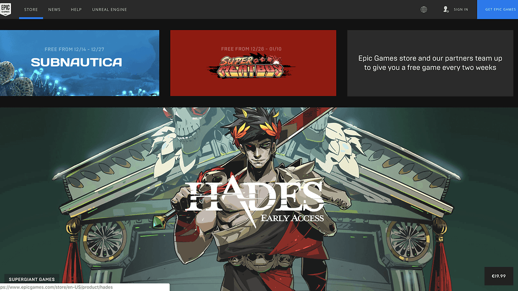 Joukosta Epic Gamesin kauppa erottuu muun muassa vaihtuvilla, aina kahden viikon mittaisilla ilmaistarjouksilla peleistä. Ensimmäinen ilmaispeli, Subnautica, tulee saataville 14. joulukuuta alkaen. Sen jälkeen 28. joulukuuta on Super Meat Boyn vuoro.