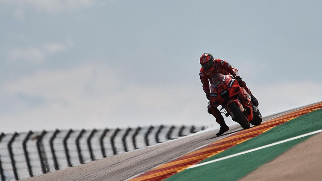Ducatin Francesco Bagnaia juhli MotoGP-uransa avausvoittoa Aragonian osakilpailussa.
