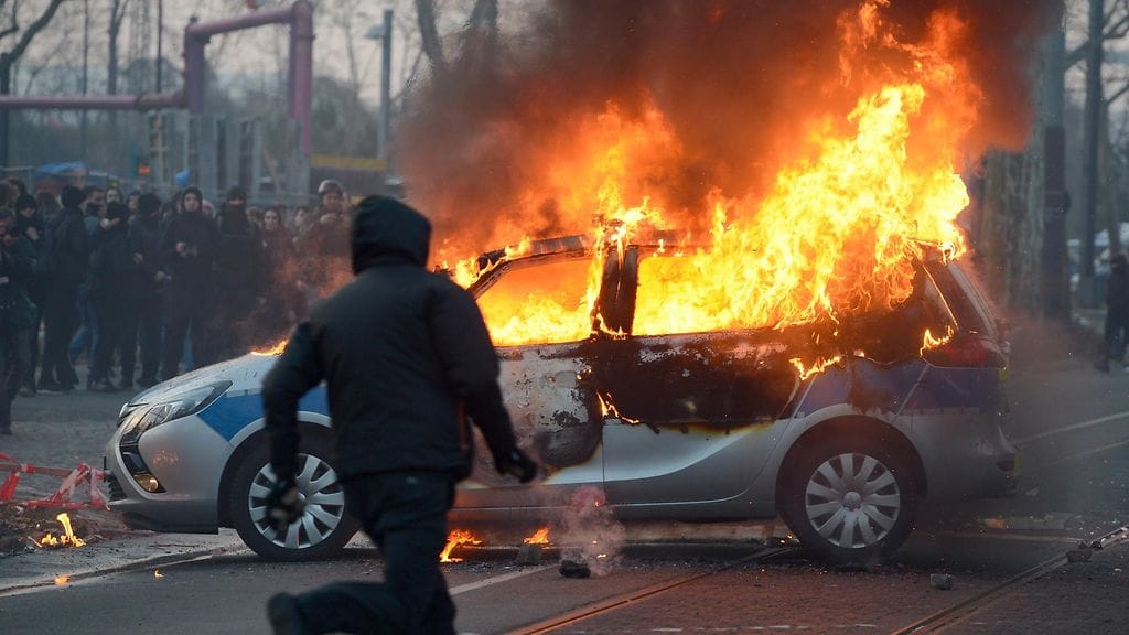 Mielensoittajat rähinöivät jo aamulla, mutta vain muutama tunti ennen EKP:n rakennuksen avajaisia väkivalta yltyi. Kapitalismia vastustavat mielenosoittajat heittelivät kiviä ja sytyttivät tuleen autoja.