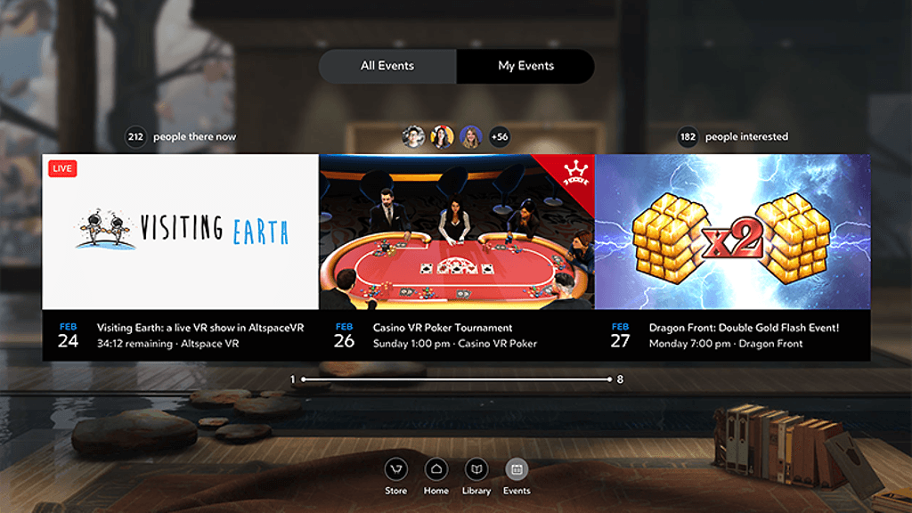 Päivitysten kierroksen täydentää nyt Oculus Events -tapahtumat, joka kokoaa yhteen paikkaan helpommin löydettäväksi erilaisia virtuaalitodellisuuden tapahtumia. Esimerkkinä annetaan pokeripelit.