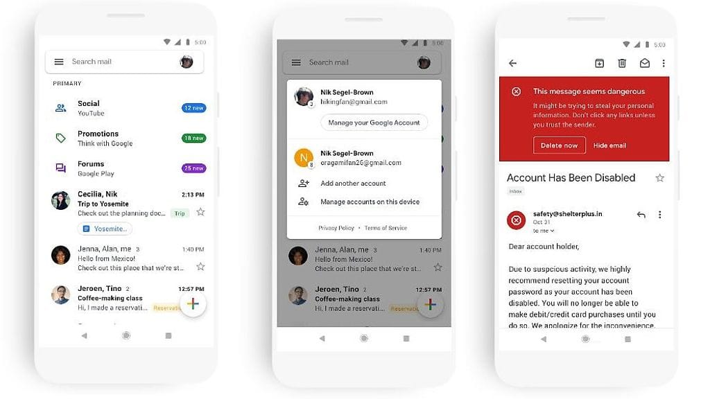 Tietoturvan kannalta on tulossa myös parannuksia. Jatkossa Google varoittaa ison punaisen bannerin kera, jos sähköpostiviesti tai sen lähettäjä vaikuttaa epäilyttävältä.