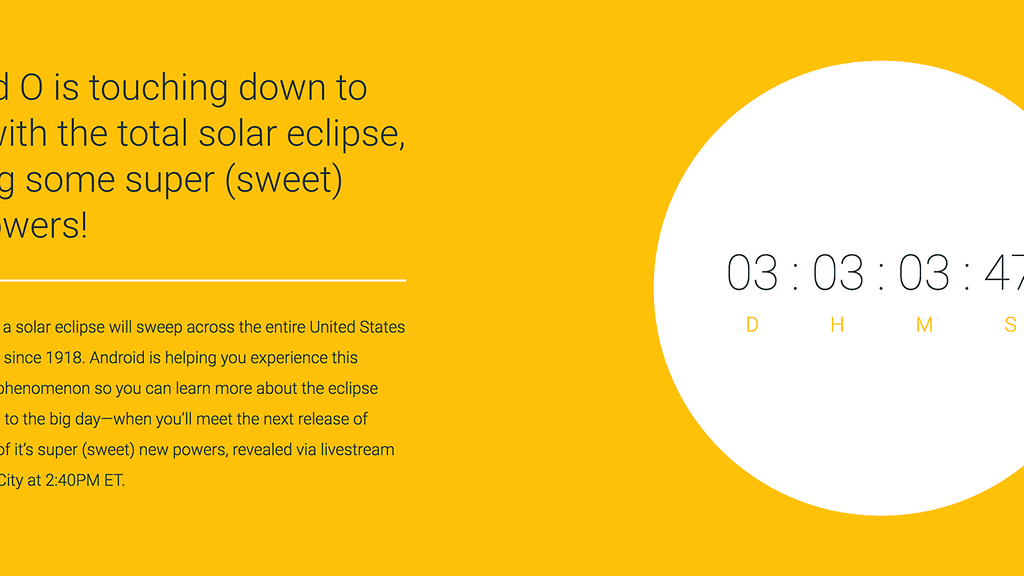 Tuolloin luvassa pitäisi olla auringonpimennyksen ohella Androidin seuraavan version, joka vielä toistaiseksi tunnetaan Android O -lyhytnimellä, julkaisu live-lähetyksessä New Yorkista. Samalla Android O:n odotetaan saavan myös pidemmän lempinimensä, mistä Google myös vihjaa puhumalla ennakkosivuillaan herkuista. Perinteiseen tapaan Google on nimennyt Android-versiot aakkosjärjestyksessä erilaisilla makeilla herkuilla.