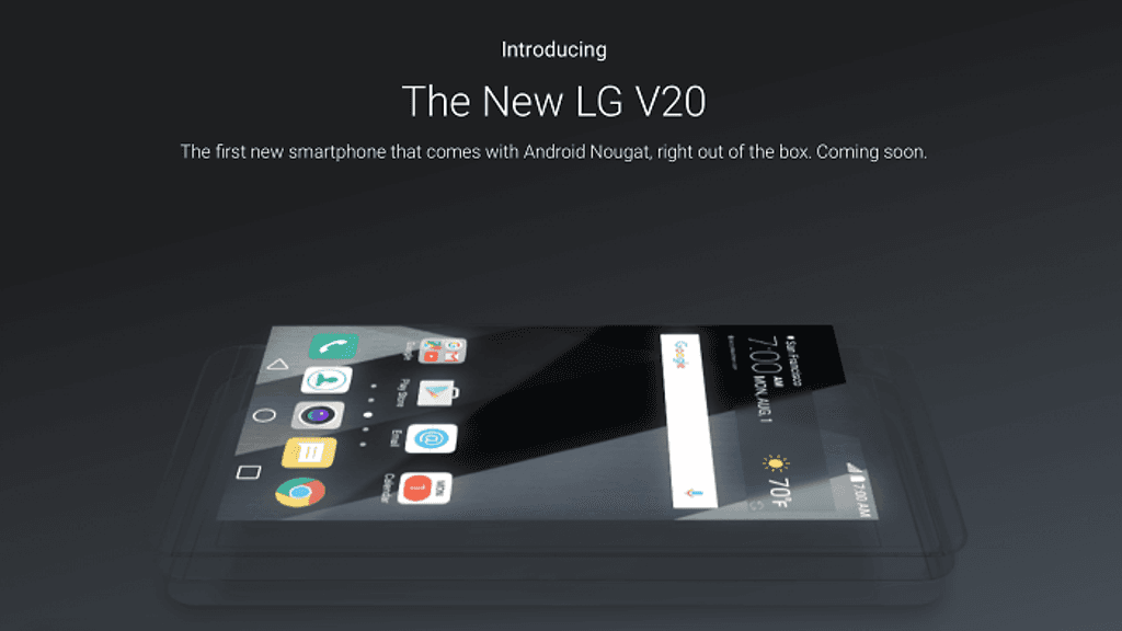 Tekstin mukaan LG V20 on ensimmäinen älypuhelin, jossa on Android Nougat heti paketista otettaessa, ja laitteen sanotaan olevan tulossa pian. Tämä toki oli jo ennestään tiedossa, sillä LG kertoi jo aiemmin V20:n todella olevan ensimmäinen Nougat-puhelin, ja laite esitellään San Franciscossa 6. syyskuuta.