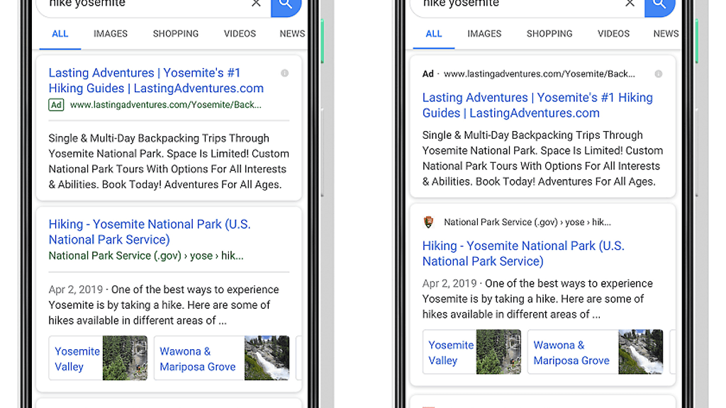 Samalla jokaisen hakutuloksen yhteyteen lisätään pienikokoinen sivuston tunnuskuva, joka Googlen mukaan auttaa käyttäjiä löytämään etsimänsä tuloksen kymmenien samankaltaisten sivustojen joukosta. Myös aiemmin vihreä mainoksesta kertova Ad-merkintä on tätä nykyä musta ja sijoittuu sivuston kuvakkeen paikalle hakutuloskortin vasempaan ylälaitaan.