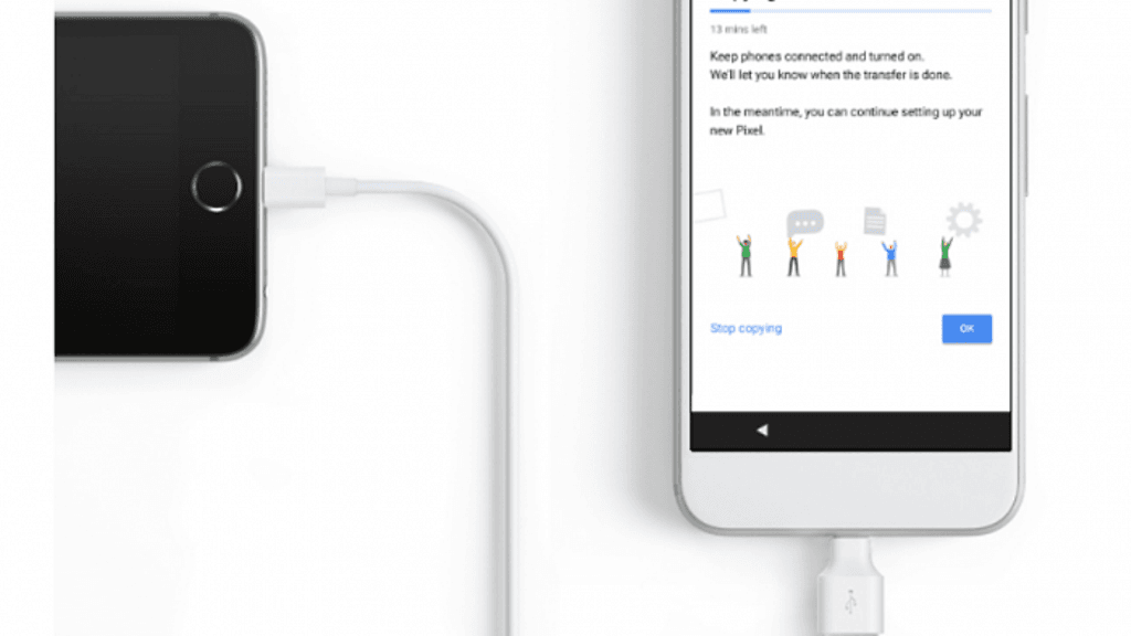 Siirtyminen iPhonesta Pixeliin on pyritty tekemään mahdollisimman helpoksi. Jokaisen Pixel-puhelimen mukana tuleekin Quick Switch -adapteri, jonka avulla Pixelin voi liittää joko iPhoneen tai toiseenAndroid-puhelimeen. Alla kuvassa adapteri näkyy Pixeliin liitettynä – lisäksi sen kanssa käytetään toiseen puhelimeen sopivaa kaapelia, kuten esimerkiksi Applen omaa Lightning-kaapelia, joka liittyy adapteriin USB-liitännällä.