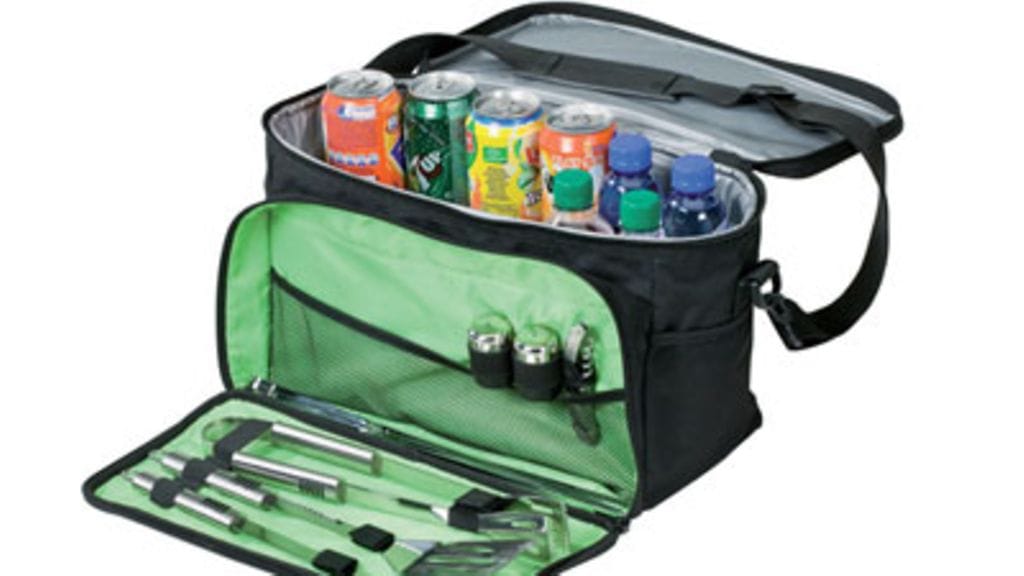 Retkellä, mökillä, veneessä ja asuntovaunussa täytyy hyödyntää pienikin tila. Kuvan laukussa mukana kulkevat eväät ja juomat. Samalla työkalut pysyvät tallessa.