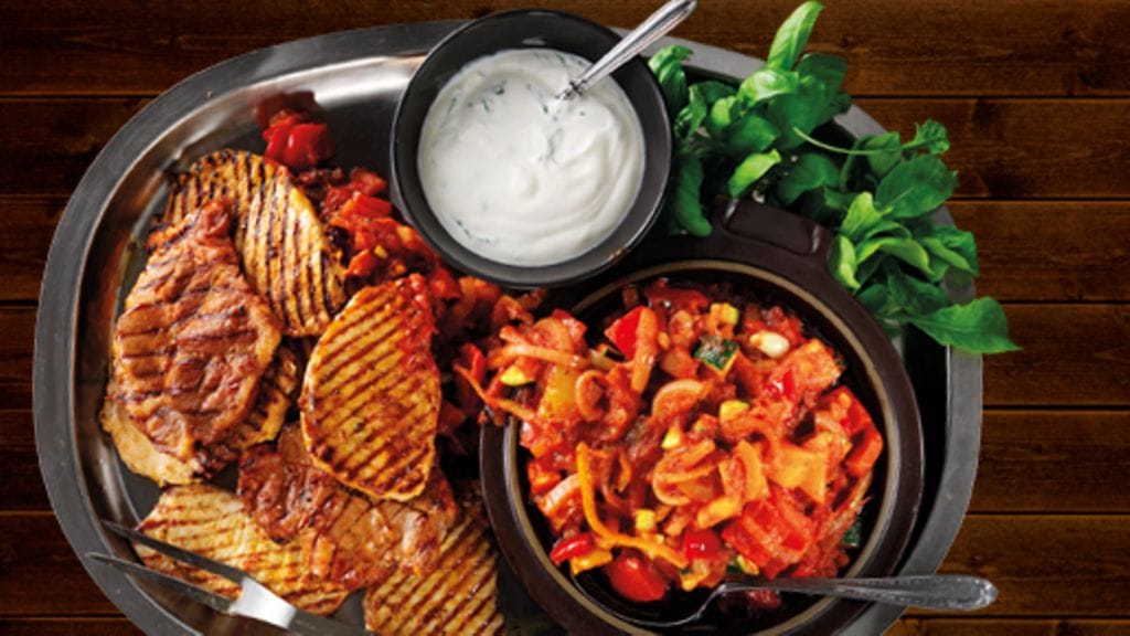 Viljaporaspaletista riittää grillattavaa isommallekin porukalle. Lisukkeeksi tehdään rataouillea ja herkullista kermaviilikastiketta.