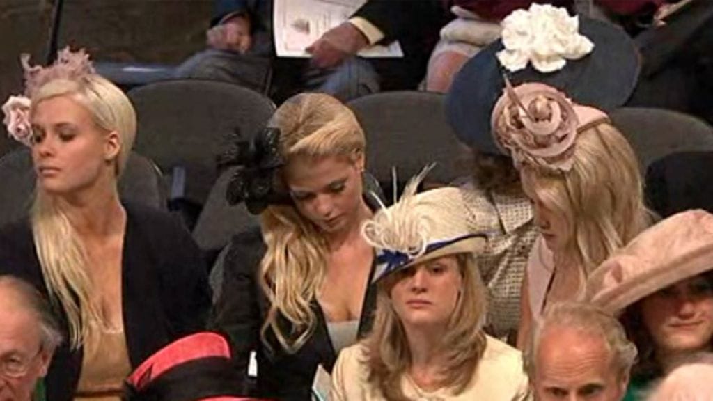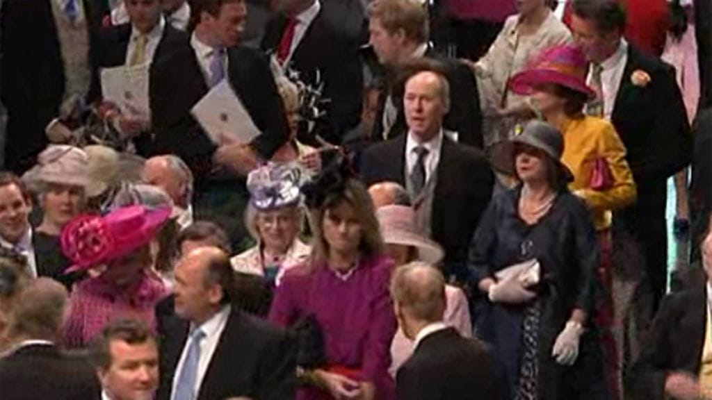Westminster Abbey täyttyy hiljalleen kuninkaallisten häiden juhlavieraista. Keväthäissä juhla-asujen trendivärit ovat keltainen ja pinkki. Häähattujen lisäksi vierailla on muhkeita kukkakoristeita asusteina.