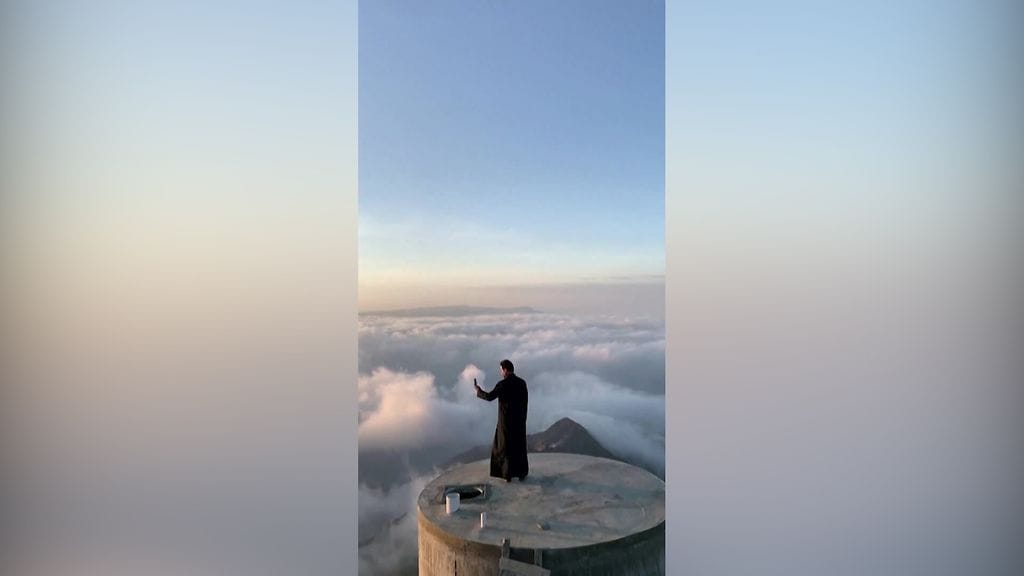 Kaksikko seisoskeli betonialustan päällä pilvien yläpuolella – ei huono tapa nauttia auringonnoususta!
