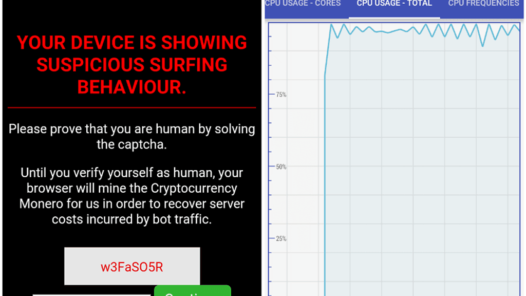 Sivuilla, jotka kaappasivat puhelimet louhimaan kryptovaluutta Moneroa, saattoi tulla ilmoitus, jossa kerrottiin louhimisesta. Sen mukaan käyttäjän internet-käyttäytyminen on epäilyttävää ja sivusto louhii Moneroa, kunnes käyttäjä todistaa olevansa ihminen CAPTCHAn avulla. Malwarelabsin mukaan ennen CAPTCHAn läpäisyä puhelin louhii täydellä teholla kryptovaluuttaa.