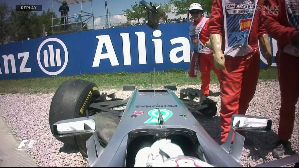 Molemmat autot päätyivät hiekalle. Hamiltonilla oli kädet silmillä jo ennen kuin auto pysähtyi soraan. Pettynyt brittikuski nakkasi ennen ylös nousemista lähes 50 000 euron arvoisen ratin menemään.