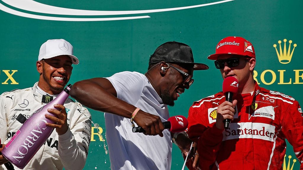 Lewis Hamilton kiusasi yleisurheilulegenda Usain Boltia Yhdysvaltain GP:n palkintopallilla.
