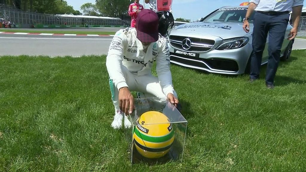 Sennan perikunta oli ehtinyt valmistautua Hamiltonin rajapyykin saavuttamiseen jo edellisessä kisassa Monacossa, joten brasilialaisen suureksi ihailijaksi tunnustautuvaa kuskia odotti aika-ajon jälkeen erityinen tervehdys: Hamilton sai perheeltä lahjaksi Sennan aidon kisassa käyttämän kypärän.