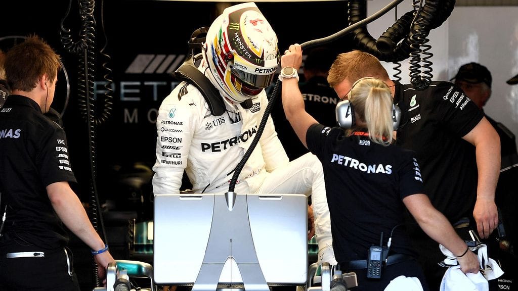Lauantain aika-ajoissa kolminkertainen maailmanmestari luisteli useampaan kertaan huonon pidon takia ja joutui jättämään keskimmäisen osion tuloksenteon viimeisen kierroksen varaan. Siinä McLarenin Stoffel Vandoorne osui seinään ja Hamilton jäi session keskeytyessä sijalle 14. Tallikaveri oli kolmas Ferrarin ja viedessä eturivin paikat.