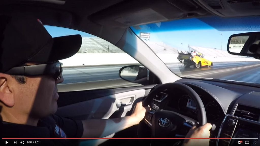 Kovinkaan reilua kilpailua ei 286-hevosvoimaisen Toyota Camryn ja Del Worshamin ohjastaman kiihdytysauton välille saatu, sillä jälkimmäinen kiihtyy nollasta sataan noin puolessa sekunnissa. Video kuitenkin demonstroi hauskalla tavalla sen, miten eri planeetalta nämä autot ovat suorituskyvyltään.