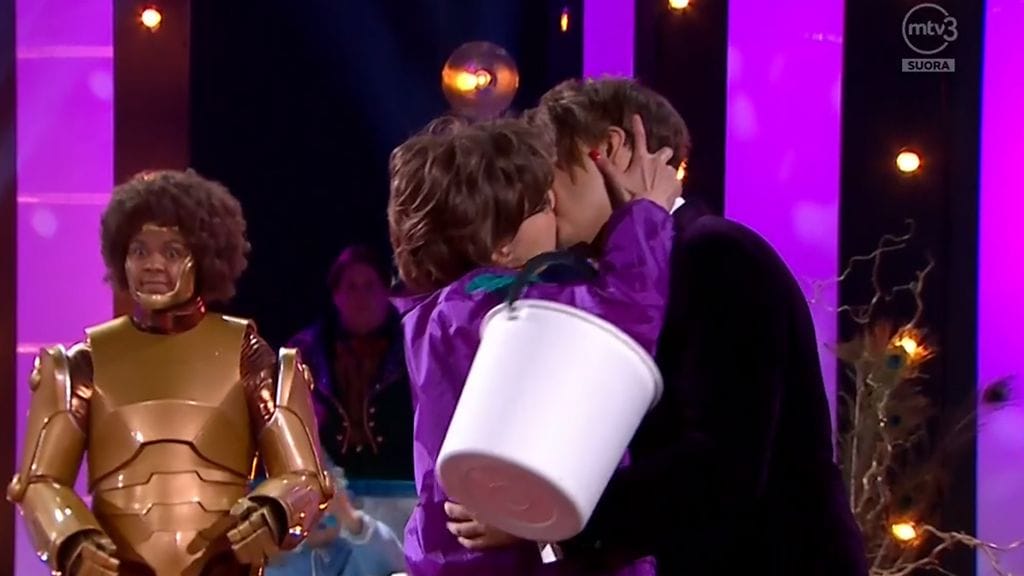 Salminen oli suudelman jälkeen selkeästi hämmentynyt. Ennen kuin hän ehti toipua yllätyksestä, myös Ernest Lawsonin esittämä Afrobotti antoi Salmiselle mojovan suudelman.