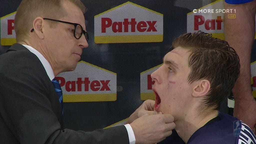 Toista kauttaan KHL:ssä kiekkoilevaa isokokoista puolustajaa paikkailtiin tilanteen jälkeen vaihtopenkillä. Kipeää teki, mutta peli jatkuu.