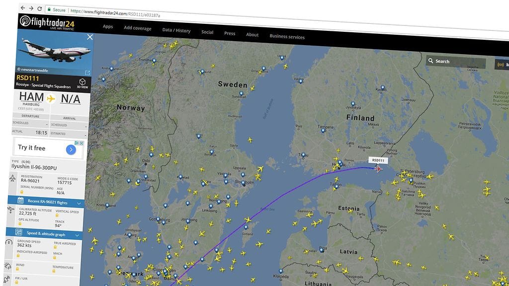 Iljušin-96-300PU-lentokoneen edellä lensi Flightradar24-sivuston mukaan Iljušin-96-300-kone, joka kuuluu myös Putinin koneisiin.