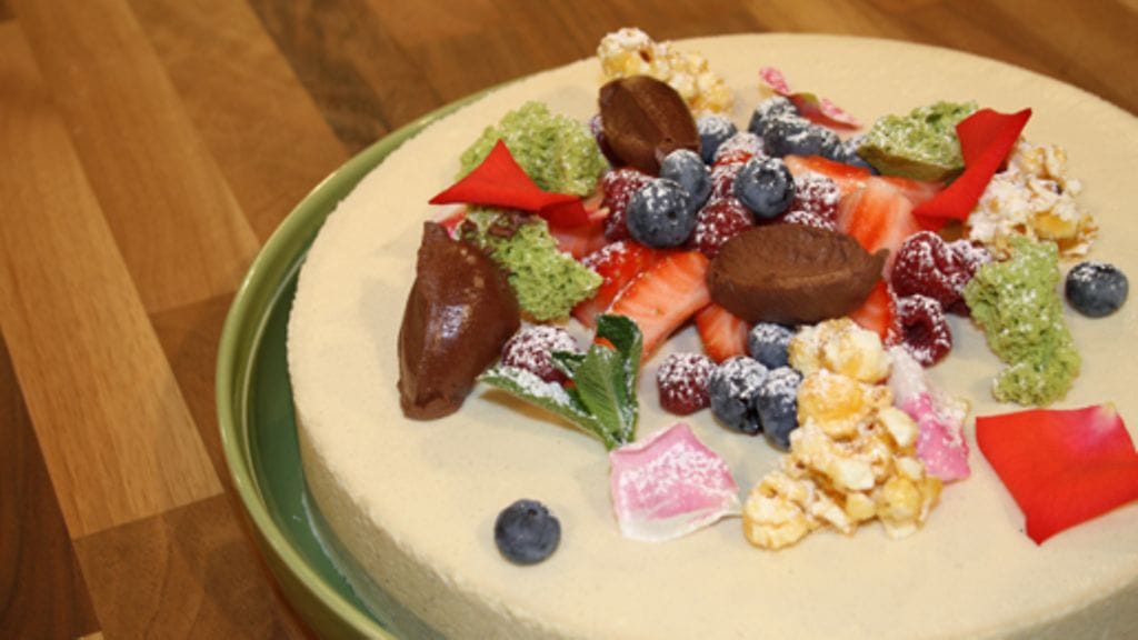 – Kun olet kostuttanut kakkupohjan, tee tämän jälkeen päälle joku mousse, esimerkiksi valkosuklaasta. Helpoin nyt on sellainen, jossa vatkataan kerma, sulatetaan suklaa ja laitetaan liivate ja sokeri. Vähän vaikeampi versio on sitten sellainen, johon tulee kananmunaa, jota vaahdotetaan sokerin kanssa. Silloin moussesta tulee kuohkeampi. Päälle voi sitten tehdä vaikka jonkun geelin. Itse pidän kinuskikakusta, joten sitäkin voi laittaa kakun väliin ja päälle.