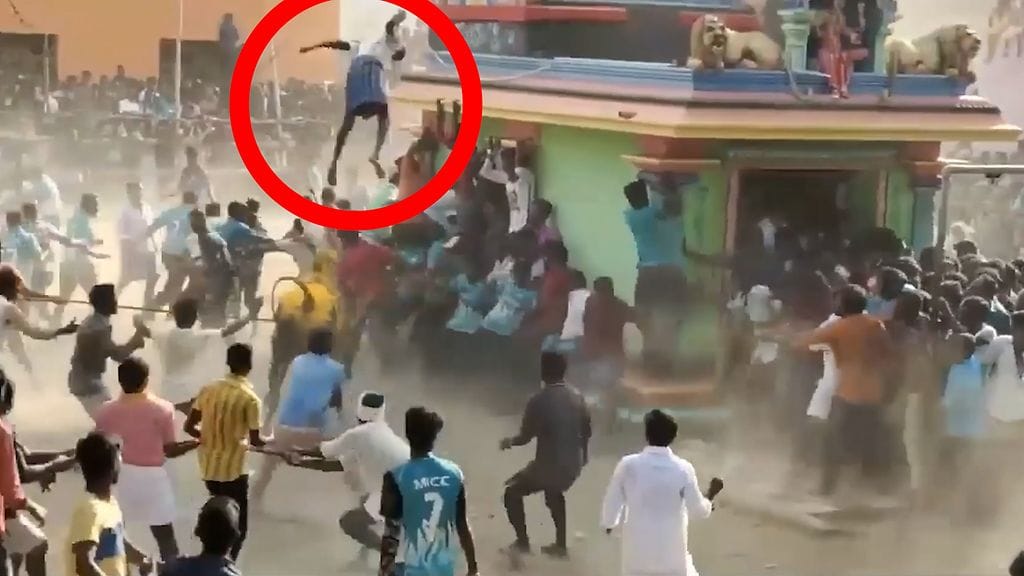 Aikuinen mies lensi ilmojen halki kuin räsynukke, kun vauhkoontunut sonni heitti hänet ilmaan Intiassa.