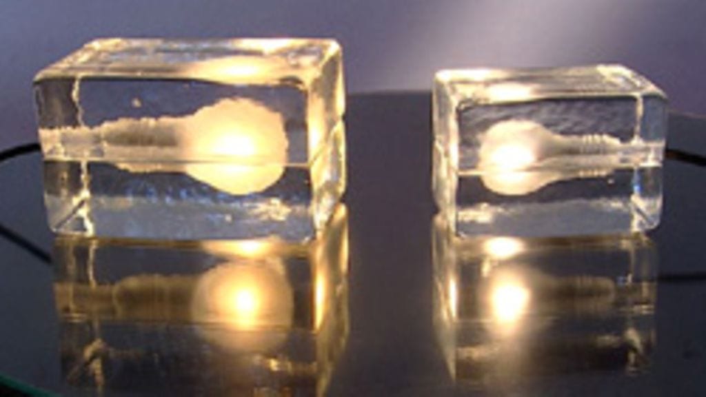 Lasikuution sisällä näyttää olevan normaali E 27 -kantainen hehkulamppu. Hehkulampun muoto on hiekkapuhallettu kuution sisäpintaan ja tuohon tilaan on saatu mahtumaan pienemmän lampun kanta ja lamppu. Nykyään on saatavana myös pienempi Block, jonka sisällä palaa halogeeni.