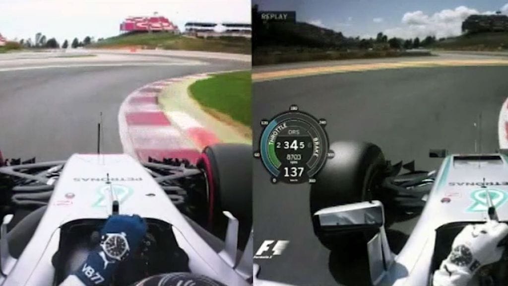 Suuremman ilmanvastuksen takia Bottas jää pääsuoralla, mutta sen jälkeen ero on murskaava: Bottaksen käsittelemä tämänvuotinen Mercedes menee radan pinnassa kuin liimattu ja eroa tulee joka mutkassa valtavasti.